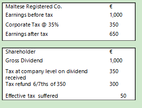 在马耳他,受征税企业主要两种类型:一是在马耳他成立并且长期居住,实际管理和监管在马耳他;二是在马耳他以外成立,但在马耳他实际管理和经营。企业所得税税率为35%,但是企业实行部分或者全部退税制度(1994年开始)。股东可以对公司在马耳他交税的6/7申请退还,可使得公司税率降为5%。退税政策的运作方法举例如下: